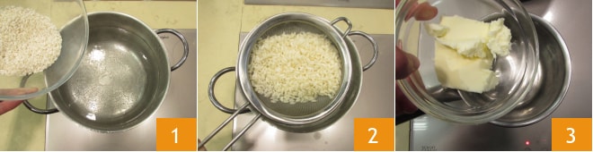 Para preparar o arroz com manteiga e parmesão, comece cozinhando o arroz: coloque-o em água fervente e salgada 1 e depois de cerca de 20 minutos, escorra 2. Enquanto isso, coloque a manteiga em uma panela pequena 3.