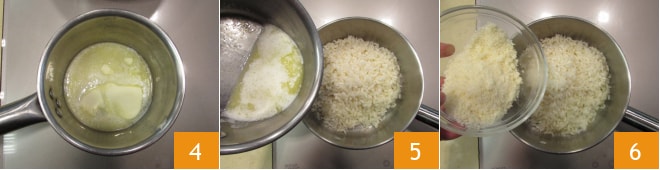 Derreta em fogo bem baixo 4 e quando derretido, despeje na panela com o arroz escorrido 5. Cozinhe em fogo baixo por alguns instantes até que a manteiga seja absorvida. Neste ponto, adicione o parmesão ralado, reservando apenas um pouco 6.
