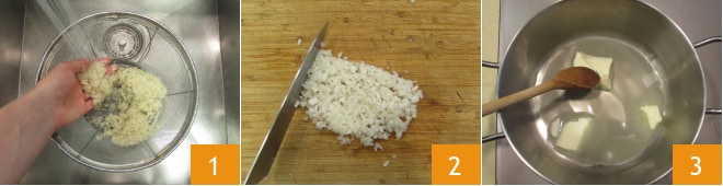 Para preparar o arroz pilaf, comece aquecendo a água em uma panela pequena. Continue enxaguando o basmati em água corrente 1. Escorra e enquanto isso, limpe e pique a cebola 2. Depois, derreta a manteiga em uma panela em fogo baixo, para não queimar 3.