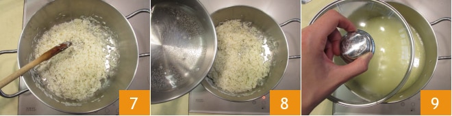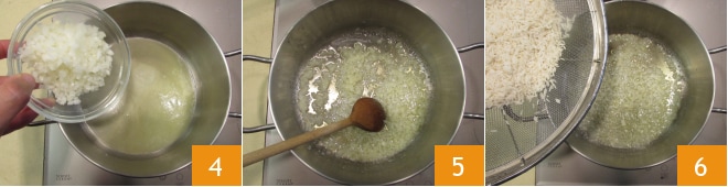 Adicione a cebola 4 e refogue por alguns minutos mexendo 5 antes de adicionar o arroz 6.