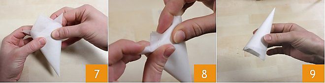 Você vai obter um cone com 3 pontas voltadas para cima 7: seguindo a direção delas, dobre as pontas para dentro do cone 8. O seu cone está pronto para ser preenchido 9.