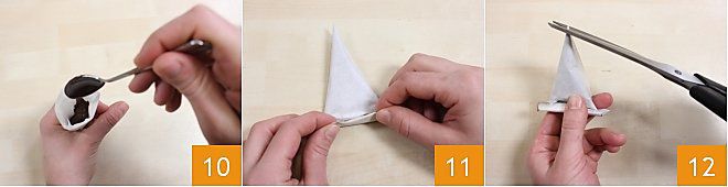 Com uma mão segure o cone e com a outra preencha-o 10 um pouco além da metade com chocolate derretido, por exemplo, e uma vez realizada essa última operação, dobre o cone em direção à ponta para fechá-lo 11. Pressione levemente o cone para empurrar o chocolate para baixo. Você pode cortar a ponta formando um orifício de saída mais largo ou mais estreito dependendo do uso que você deseja fazer 12. O seu cone de papel manteiga está pronto, agora você pode se divertir com as decorações!