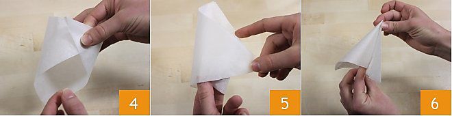 Una os dois cantos da base 4, sobreponha-os, enrole as bordas do papel manteiga sobre si mesmas 5 e feche até formar um cone (a ponta deve ser formada pela base do triângulo) 6.