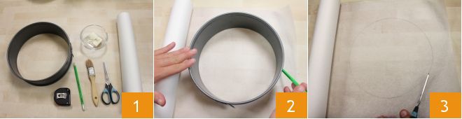 Para forrar uma forma com papel manteiga, você precisará de: papel manteiga, manteiga amolecida, um lápis, um pincel, tesouras e uma régua 1. Coloque a forma ou assadeira sobre o papel manteiga e trace com o lápis o perímetro da borda externa 2, então corte com a tesoura 3.