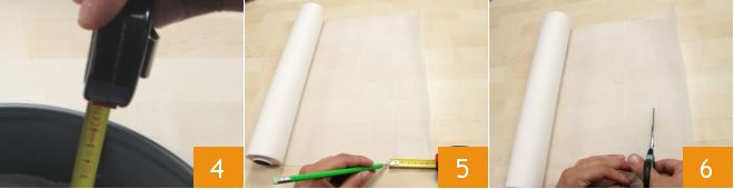 Agora prepare o papel manteiga para revestir a borda da forma: meça a altura 4 e marque no papel manteiga com pequenos traços de lápis 5; então corte as tiras 6.