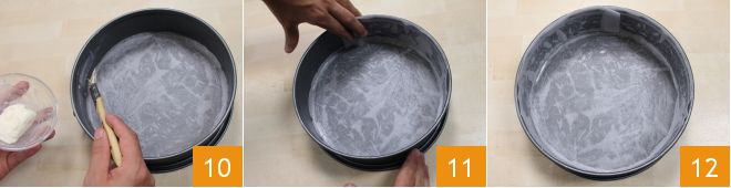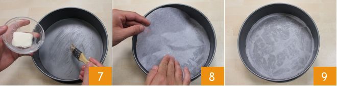 Com o pincel, espalhe manteiga bem amolecida na superfície da forma 7 e faça aderir o papel manteiga no fundo (8-9).
