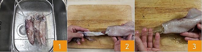 Limpar lulas frescas é uma operação simples. Todas as partes do molusco podem ser utilizadas, por isso, uma vez destacadas do corpo central, reserve-as. Comece as operações enxaguando as lulas em água corrente 1, depois, com as mãos, destaque delicadamente a cabeça do manto e reserve-a 2. Depois de retirar a cabeça, ainda com as mãos, procure a pena de cartilagem transparente que se encontra no manto e extraia-a delicadamente 3.