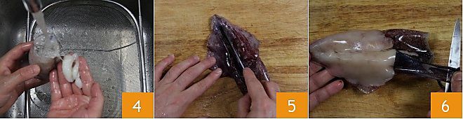 Passe novamente a lula sob água corrente, lave-a bem e use as mãos para extrair as vísceras do manto 4. Se a lula tiver a bolsa de tinta e você quiser usá-la na cozinha, encontre a bolsa na cavidade do manto, esprema o líquido e reserve-o em uma tigela, enquanto as vísceras podem ser descartadas. Passe então a eliminar a pele externa: faça um pequeno corte com uma faquinha na parte final do manto, o suficiente para pegar uma ponta da pele 5 e retire completamente a cobertura com as mãos ou ajudando-se com uma faquinha 6.