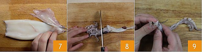 Para terminar a limpeza do manto, ainda com uma faquinha, remova as nadadeiras para usá-las nas preparações 7. Agora retome a cabeça que você havia reservado e separe-a dos tentáculos cortando com uma faquinha pouco abaixo dos olhos 8. Pegue os tentáculos e elimine o dente central da seguinte forma: abra os tentáculos para fora com as mãos e empurre para cima a parte central (ou seja, a boca) 9. Se a lula for de grandes dimensões, você pode evitar separar a cabeça dos tentáculos: basta retirar os olhos e remover o dente.