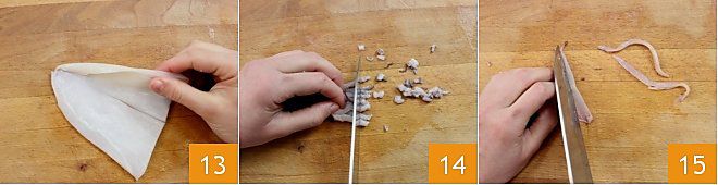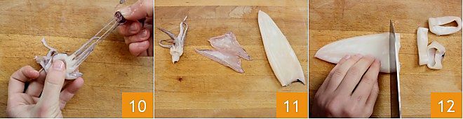 Se preferir a lula ensopada, você pode abrir o manto como um livro: com uma faca, faça um corte na parte final e deslize a lâmina por todo o comprimento 13. Os tentáculos podem ser deixados inteiros ou triturados para serem adicionados às preparações 14. As nadadeiras também podem ser cozidas: corte-as em tiras finas e adicione à receita 15. Os tempos de cozimento das lulas dependem não apenas do uso, mas também do tamanho do molusco. Não se recomenda cozinhar a lula por muito tempo, para não correr o risco de ficar borrachuda.