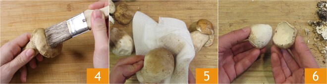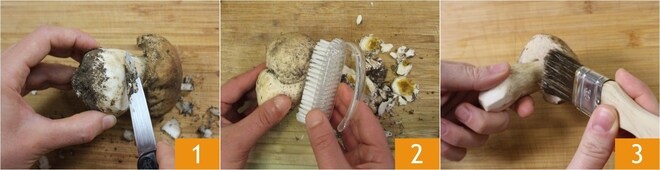 Para limpar os porcini, primeiro remova a parte terrosa da base do caule usando uma faquinha de lâmina lisa e afiada ou uma faca de legumes 1. Esfregue delicadamente o restante do caule com uma escovinha para remover a terra restante 2. Neste ponto, pegue um pincel e limpe a parte inferior do chapéu 3.