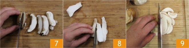 Agora que os porcini estão limpos, você pode proceder ao corte, dependendo do uso que fará deles. Se os cogumelos são grandes, é aconselhável separar a cabeça do caule: coloque a parte superior no tabuleiro com a parte abaulada para cima e corte em fatias, mais ou menos finas. O caule pode ser fatiado tanto na largura quanto no comprimento 8. Se os cogumelos são pequenos, você pode deixá-los inteiros e cortar as fatias sempre no sentido do comprimento 9. Seus porcini estão prontos para serem cozinhados!