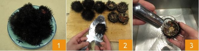 Limpar os ouriços-do-mar é uma operação muito simples, para realizá-la você precisará apenas de uma ferramenta específica: o abridor de ouriços. Para saber se estão frescos, preste atenção a apenas uma coisa: eles devem cheirar a mar. Proceda então pegando seus ouriços 1 e comece a abri-los usando a ferramenta indicada. Corte a parte superior do ouriço 2, que se reconhece pela boca; cortada essa parte, esvazie o ouriço da água e das algas internas e enxágue-o sob água corrente 3.