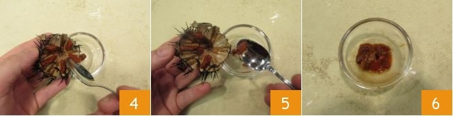 Proceda, neste ponto, a extrair os ovos ajudando-se com uma colherzinha 4, então pegue apenas a parte laranja 5. Coloque-os em uma tigelinha 6 e use-os como preferir. Particularmente valiosos pelo sabor e consistência são os de vermelho coral intenso. Os ouriços-do-mar são excepcionais tanto crus quanto cozidos.