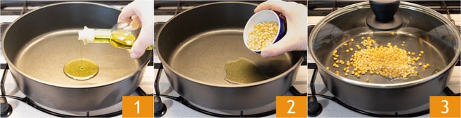 Para preparar a pipoca, coloque um fio de óleo em uma panela grande com fundo grosso 1 e, sem aquecer, adicione os grãos de milho 2. Acenda o fogo e mantenha em chama alta, cubra a panela com a tampa 3, após cerca de 3 minutos a pipoca começará a estourar, agite a panela e coloque de volta no fogo em chama moderada, continue agitando frequentemente até que não estourem mais: levará cerca de 10 minutos.