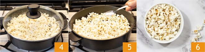 Uma vez pronta 4, adicione ½ colher de chá de sal (ou a gosto) 5, agite novamente para que a pipoca fique bem temperada. Desfrute suas pipocas quentes 6!