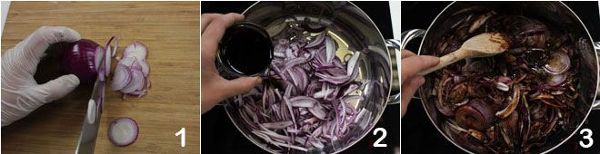 Para preparar a compota de cebolas de Tropea ao balsâmico, comece pela limpeza das cebolas: lave, descasque e corte as cebolas em fatias 1 (para esta operação, recomendamos o uso de luvas descartáveis para evitar que o cheiro de cebola fique nas mãos). Pegue uma panela, adicione as cebolas e o vinagre balsâmico 2, e deixe murchar por 10 minutos em fogo baixo, mexendo frequentemente 3.