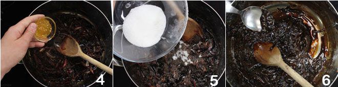 Quando as cebolas estiverem murchas, adicione o mel 4 e o açúcar 5 e deixe cozinhar por cerca de 45 minutos em fogo bem baixo, continuando a mexer frequentemente 6; verifique se a compota permanece macia e não tende a "caramelizar". Quando o tempo indicado tiver passado, verifique o cozimento fazendo o teste do pires: despeje uma colher de chá de compota de cebolas de Tropea ao balsâmico em um pires inclinado, estará pronto se não escorrer, mas permanecer bastante compacta e homogênea, caso contrário, cozinhe um pouco mais.