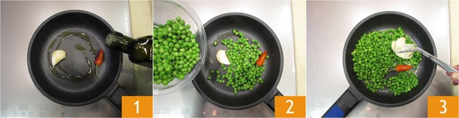 Para preparar os conchiglioni de mortadela e ervilhas, comece pelo molho: numa frigideira adicione um fio de azeite e acrescente o dente de alho e a pimenta inteira 1. Deixe refogar os ingredientes por 2-3 minutos e acrescente as ervilhas 2. Salteie as ervilhas em fogo alto por 5 minutos, desligue o fogo e adicione sal a gosto. Retire o alho e a pimenta 3. Reserve.