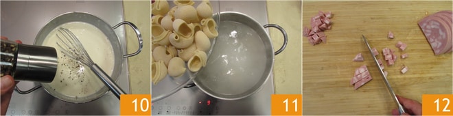 Aromatize com pimenta a gosto 10. Quando estiver pronto, despeje o bechamel em uma travessa baixa e larga e cubra com papel manteiga em contato. Reserve à temperatura ambiente até o uso. Cozinhe os conchiglioni em água fervente com sal por 8-10 minutos, devem ficar al dente 11. Enquanto isso, corte a mortadela em cubos de cerca de ½ cm 12.