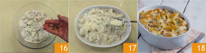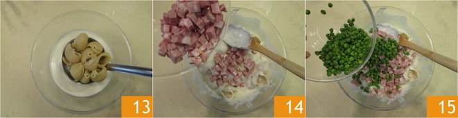 Em uma tigela grande, coloque o bechamel e os conchiglioni cozidos al dente 13. Misture os ingredientes e adicione também a mortadela 14 e as ervilhas 15.