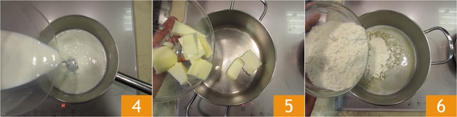 Prepare o molho bechamel: despeje o leite em uma panela e aqueça 4. Coloque a manteiga em outra panela e deixe derreter em fogo baixo 5, depois adicione a farinha de uma só vez 6. Mexa vigorosamente para evitar a formação de grumos.