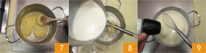 Continue a mexer até obter uma mistura dourada, o roux 7. Neste ponto, dilua o roux adicionando primeiro um pouco de leite quente e depois todo o restante 9. Continue mexendo em fogo baixo até atingir a consistência desejada; cozinhando o bechamel por 5-6 minutos, você obterá uma densidade média. Adicione sal a gosto 9.