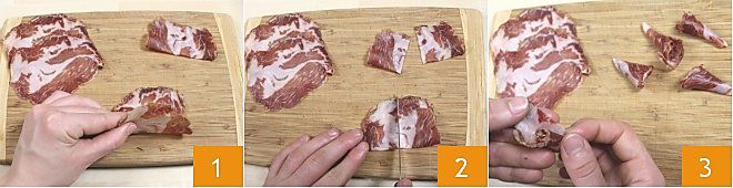 Para preparar o cone de capocollo recheado em folhas clássicas, pegue as fatias de capocollo (ou copa), dobre-as ao meio 2 e corte-as em duas partes iguais 2, então forme cones com cada pedaço, envolvendo o capocollo sobre si mesmo 3.