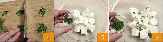 À parte, coloque o queijo de cabra em uma tigela e pique finamente a menta e o endro, ajudando-se com uma faca 4, depois adicione as ervas aromáticas ao queijo (5-6). Misture bem para amalgamar todos os ingredientes, depois adicione sal e pimenta a gosto 7.