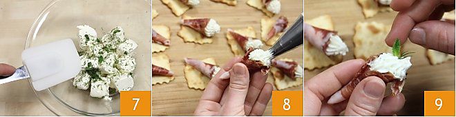Transfira a mistura para uma sac à poche com bico estrela, depois preencha cada cone com o creme de queijo de cabra com ervas 8. Coloque um cone sobre cada folha e decore com uma folhinha de menta e endro como mostra a foto 9. O cone de capocollo recheado em folhas clássicas está pronto 9, recomendamos servi-lo e apreciá-lo na hora!