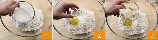 Para preparar os confetes e serpentinas, comece fazendo a massa básica: em uma tigela (ou na tigela de uma batedeira com batedor plano, velocidade média), coloque a farinha de trigo, faça um buraco no centro e adicione o açúcar 1, depois as raspas de um limão não tratado, a vanilina e o sal 2. Adicione também a manteiga amolecida à temperatura ambiente 3 e então quebre os ovos em outra tigela,