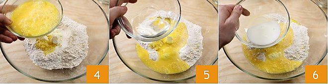 adicione-os aos outros ingredientes 4. Finalmente, adicione a cachaça ou o rum, se preferir, que servirá para aromatizar a massa, e o leite (5-6). O álcool evaporará totalmente durante a cocção, então não há perigo para as crianças, mas se você quiser evitar o uso de álcool, aromatize os confetes e serpentinas com uma ampola de aroma de rum.