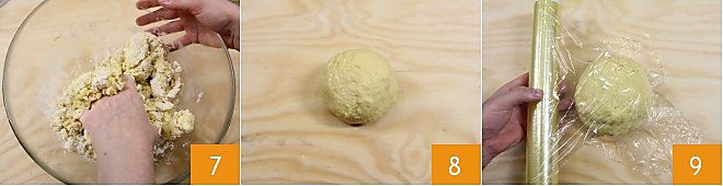 Misture tudo com as mãos 7, até obter uma massa lisa, homogênea e compacta 8, que você cobrirá com filme plástico e deixará descansar em um local fresco (mas não na geladeira) por pelo menos 30 minutos 9.