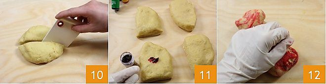 Passado esse tempo, divida a massa em partes iguais 10, uma para cada tonalidade que você quiser dar aos seus docinhos: nós usamos 4 corantes diferentes, amarelo, azul, vermelho e verde, mas você pode escolher as cores que preferir! Adicione ao centro de cada pedaço de massa, um pouco de corante alimentício 11. Para um melhor resultado, recomendamos usar corantes em gel. ATENÇÃO: sempre use luvas de látex descartáveis durante essas operações, para não manchar suas mãos; troque as luvas para cada pedaço de massa a ser colorido, para não misturar as cores entre si. Misture agora um pedaço de cada vez, para integrar a cor: se não estiver satisfeito com a tonalidade, adicione mais corante até obter a intensidade desejada 12. Enquanto você prossegue com a coloração de um pedaço, lembre-se sempre de cobrir a massa restante com filme plástico, senão ela secará e ficará muito seca.