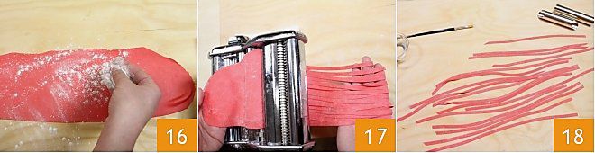 Quando tiver obtido uma folha da espessura de 1 mm, polvilhe-a um pouco com farinha 16 e passe-a pelos rolos dentados largos, os usados para tagliatelle: você deve obter tiras longas (17-18). Para modelar as serpentinas você precisará de cilindros metálicos, aqueles geralmente usados para formar canudos, um pincel e uma clara de ovo para pincelar.