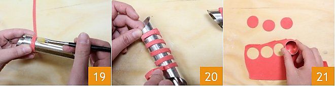 Enrole uma tira de massa no cilindro, pincele a primeira volta de massa com clara de ovo e enrole outra volta por cima. Desta forma, você fixará bem sua serpentina 19, mas tome cuidado para não pincelar o cilindro com a clara, senão as serpentinas não se soltarão da massa. Enrole o restante da tira ao redor do cilindro e fixe também na parte final com uma volta dupla fixada com clara, como feito antes 20. As serpentinas terão assim a típica forma de espiral! Em seguida, prossiga com a abertura da segunda parte da massa colorida, obtendo sempre uma lâmina com espessura de 1 mm, da qual você cortará, com um pequeno cortador redondo (diâmetro de 3 cm), círculos, ou seja, seus confetes 21. Reamasse os pedaços de massa e corte mais confetes.