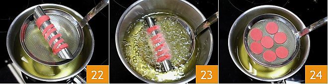 Agora você está pronto para fritar: aqueça o óleo, cuja temperatura deve oscilar entre 170° e 180°, coloque em uma escumadeira uma serpentina de cada vez e, delicadamente, mergulhe-a no óleo (22-23). Ela deve cozinhar por poucos segundos, para não alterar muito as cores brilhantes da massa. Faça o mesmo com os confetes 24. Se preferir, você pode tentar também a cocção no forno a 180 graus por 20 minutos (forno estático), obviamente o resultado não será o mesmo, os confetes, por exemplo, não ficarão inchados como os fritos, e também as cores podem ficar alteradas!