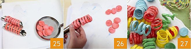 Uma vez cozidos (levará cerca de 30 segundos), escorra os confetes e as serpentinas e deixe-os secar sobre papel absorvente 25. Quando estiverem mornos, desenforme as serpentinas, retirando cuidadosamente o cilindro metálico e seus docinhos de Carnaval estarão prontos 27. Proceda do mesmo modo com as outras massas de cores diferentes! Aos seus confetes e serpentinas falta apenas uma polvilhada de açúcar de confeiteiro, se desejar!