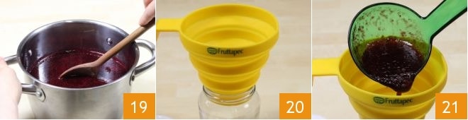 se dissolva completamente 19. Prepare os potes que você já sanitizou e providencie um funil para facilitar o envase da geleia 20. Despeje a geleia ainda quente, com a ajuda de uma concha 21 e