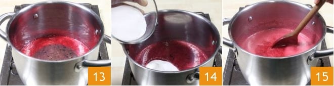 Após 1 minuto, adicione o açúcar 16 e leve a mistura novamente à fervura. Deixe ferver por 3 minutos em fogo alto 17, sempre mexendo. Retire a panela do fogo e mexa novamente, para que qualquer espuma que se formou na superfície 18,