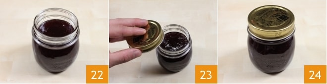 encha o recipiente, cuidando para deixar 1 cm da borda 22, depois, com as tampas apropriadas, feche-os 23, apertando bem e garantindo que estejam hermeticamente fechados. Com o calor da geleia, será criado o vácuo, que permitirá conservar o produto por um longo tempo. Assim que os frascos esfriarem, verifique se o vácuo ocorreu corretamente: você pode pressionar o centro da tampa e, se não ouvir o tradicional "click-clack", o vácuo ocorreu. Sua geleia de groselha vermelha e mirtilos está pronta 24.