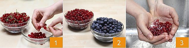 Para preparar a geleia de groselha vermelha e mirtilos, comece a destacar delicadamente as groselhas dos galhos e coloque-as em uma tigelinha 1. Prepare também uma tigelinha para os mirtilos 2. Lave bem em água corrente primeiro as groselhas 3 e depois