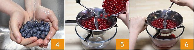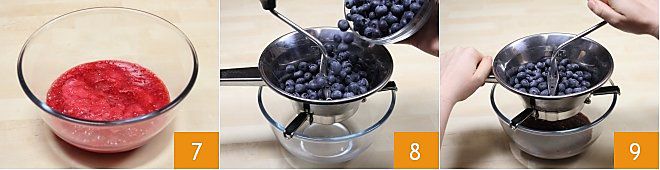 assim para extrair o suco e a polpa das groselhas 7. Despeje os mirtilos no passa-verduras 8; passe várias vezes também com movimentos lentos 9,