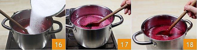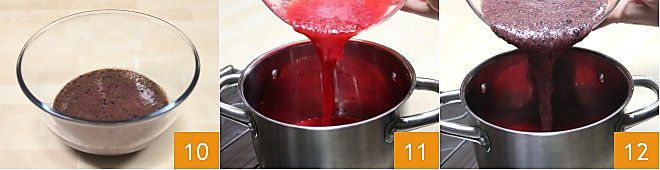 assim para obter o suco e a polpa dos mirtilos 10. Em uma panela de aço alta e grande, despeje primeiro a polpa de groselha 11 e depois a polpa de mirtilos 12.
