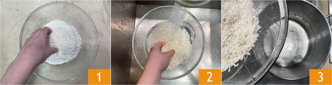 Para preparar o congee, comece com o arroz glutinoso 1, enxágue-o em água corrente 2 duas vezes. Despeje a água em uma panela, coloque no fogo e leve à fervura, então despeje o arroz e deixe cozinhar em fogo baixo por cerca de 45-50 minutos 3.