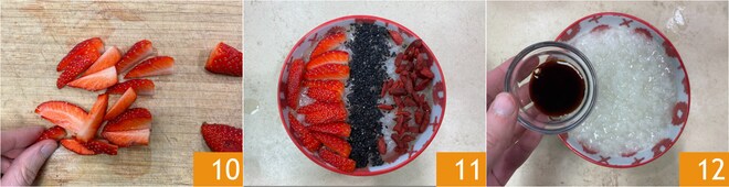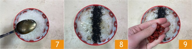 Em uma tigela, prepare o congee doce: tempere com mel 7, açúcar, sementes de gergelim preto 8 e bagas de goji 9.
