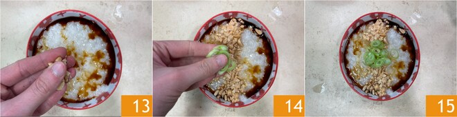 Guarneça com granulado de amendoim 13 e rodelas de cebolinha fresca 14. O congee salgado também está pronto para ser servido 15.