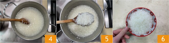 Misture de vez em quando para evitar que grude no fundo 4. No final do cozimento, quando o arroz estiver denso e cremoso 5, despeje-o em duas tigelas separadas 6.