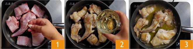 Para preparar o coelho na panela, primeiro coloque o óleo em uma frigideira antiaderente, disponha os pedaços de coelho e adicione o alho com casca 1. Doure em fogo alto por alguns minutos de ambos os lados da carne, depois regue com vinho branco 2 e deixe evaporar toda a parte alcoólica 3.