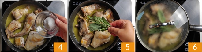 Ajuste o sal e a pimenta 4, em seguida adicione algumas folhas de sálvia e alguns ramos de alecrim 5. Cubra com uma tampa 6 e cozinhe em fogo baixo por 30 minutos.
